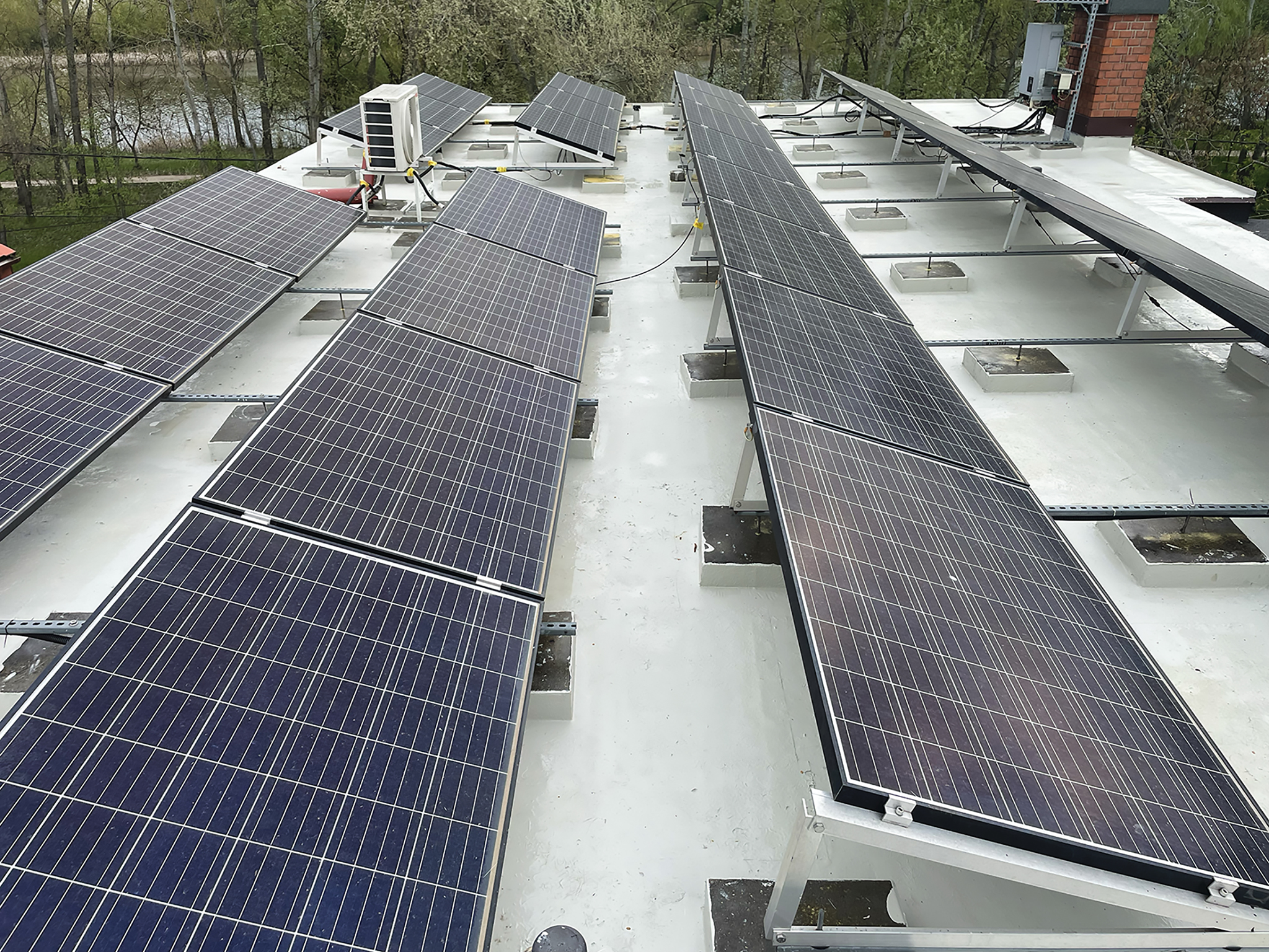 Napelemekkel fedett lapostetős épület bitumenes csapadékvízszigetelését kellett felújítanunk úgy, hogy sem a panelek, sem azok tartószerkezete nem volt elmozdítható. A körülmények eleve nem tették lehetővé a nyílt lángot igénylő technológia alkalmazását, a tagolt felület miatt viszont semmilyen lemezes vízszigetelés beépítése nem volt lehetséges. A tetőt ezért egy üvegszövet hordozóréteggel erősített 1-komponensű kenhető bevonatszigeteléssel láttuk el. A szigetelés fehér színe kettős előnyt nyújt: a világos felület nagyobb napsugárzás-visszaverő képességgel bír, így csökkenti a tetőfelület felmelegedését, másrészt viszont pozitív hatással van a napelem-panelek áramtermelő kapacitására.