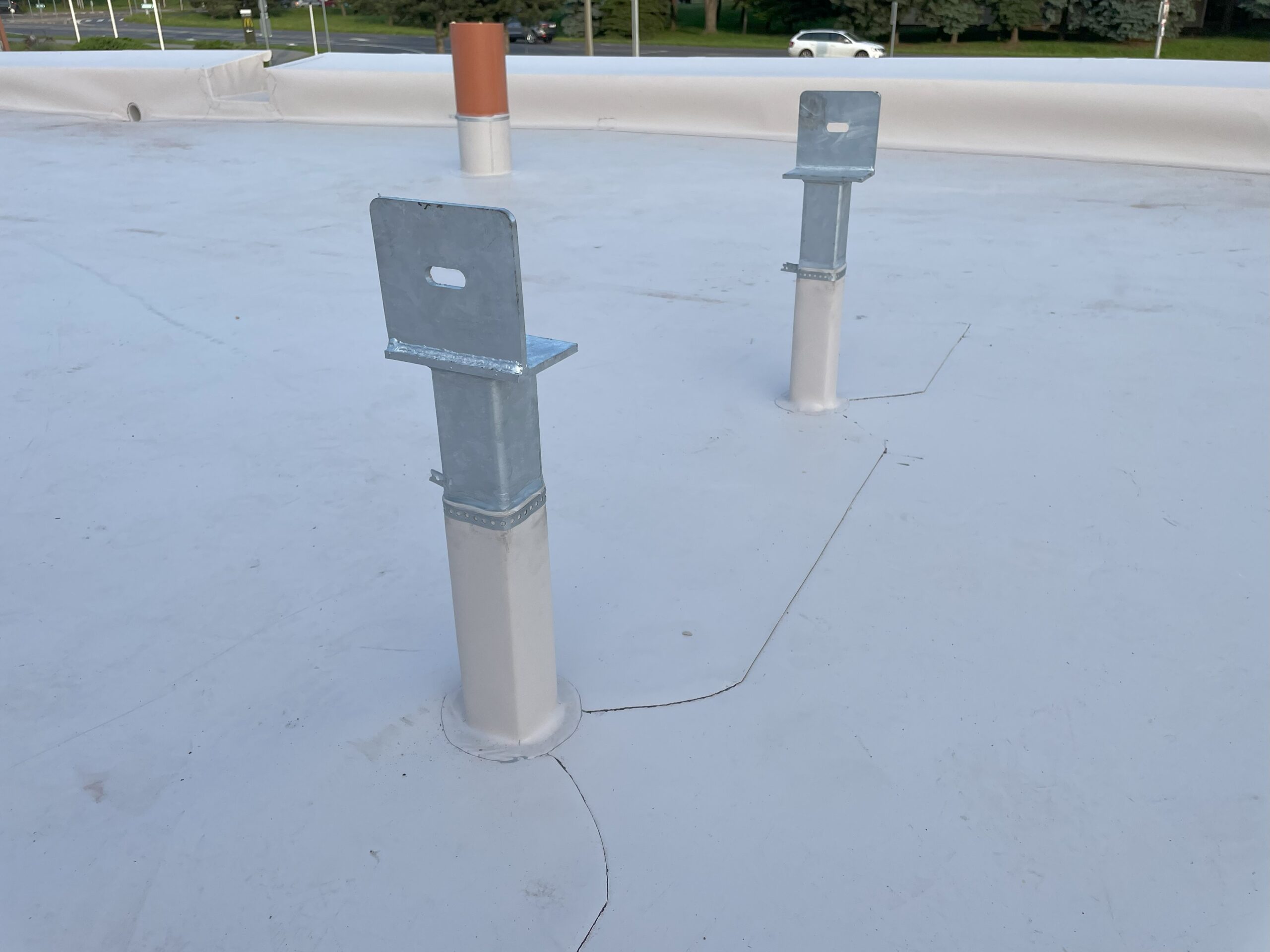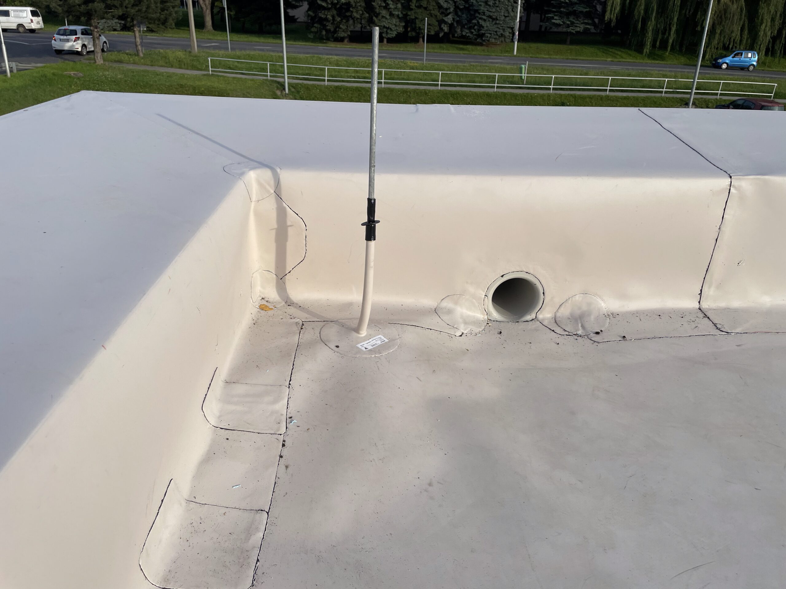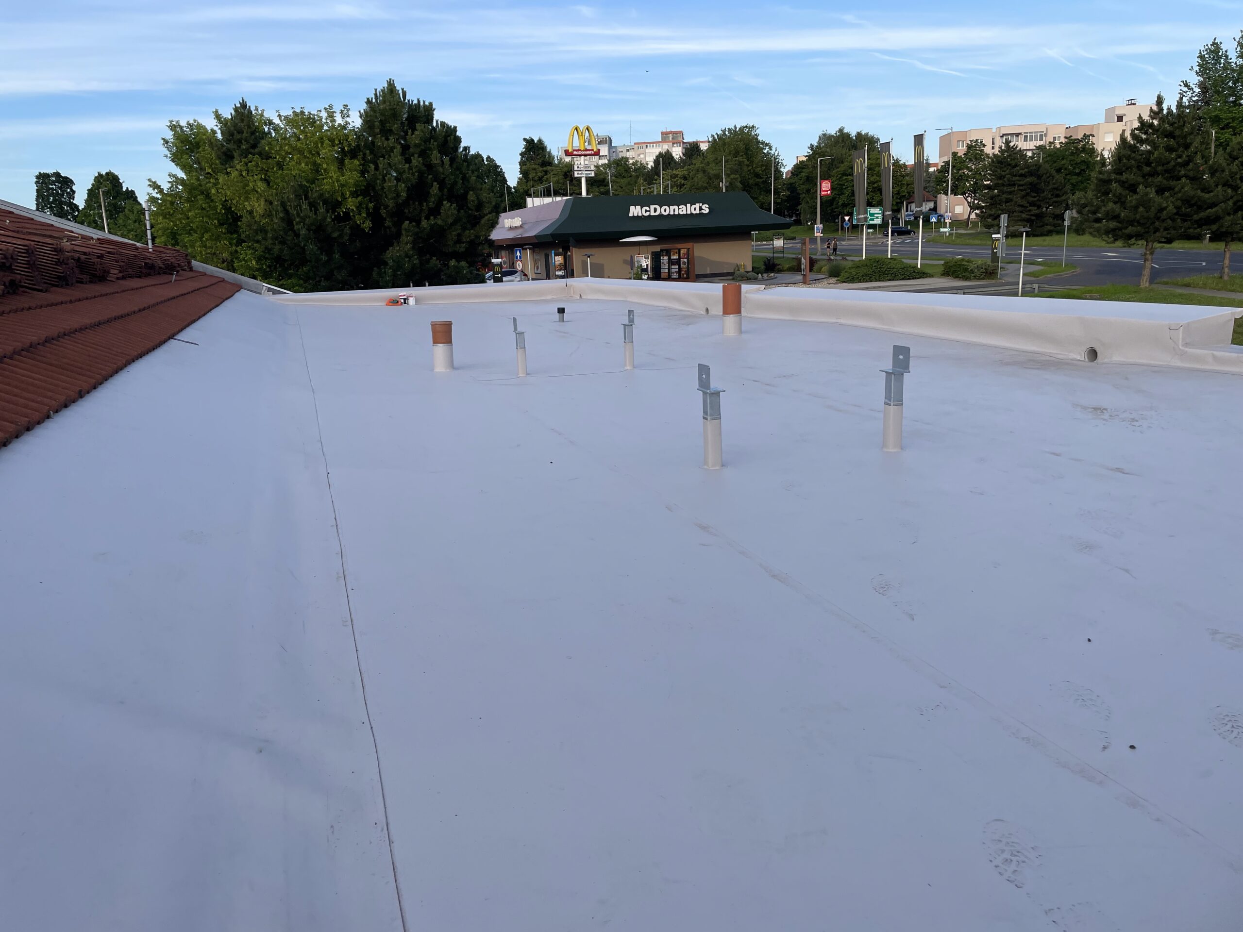 Meglévő áruházhoz hozzáépített épületrész tetőszigetelését hosszútávra biztosítottuk a 2mm vtg. FPO-alapú csapadékvíz-elleni szigetelési rendszer beépítése által.